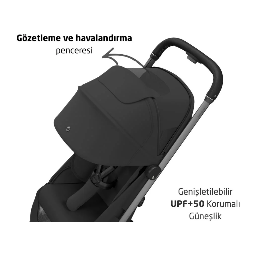 UV filtreli geniş tente, küçük çocuğunuzu güneşten, rüzgardan ve hafif yağmurdan korur. Dahili havalandırma penceresi, yeterli hava sirkülasyonu sağlar ve yürüyüşünüzü kesmeden çocuğunuza hızlıca göz atmanıza olanak tanır.