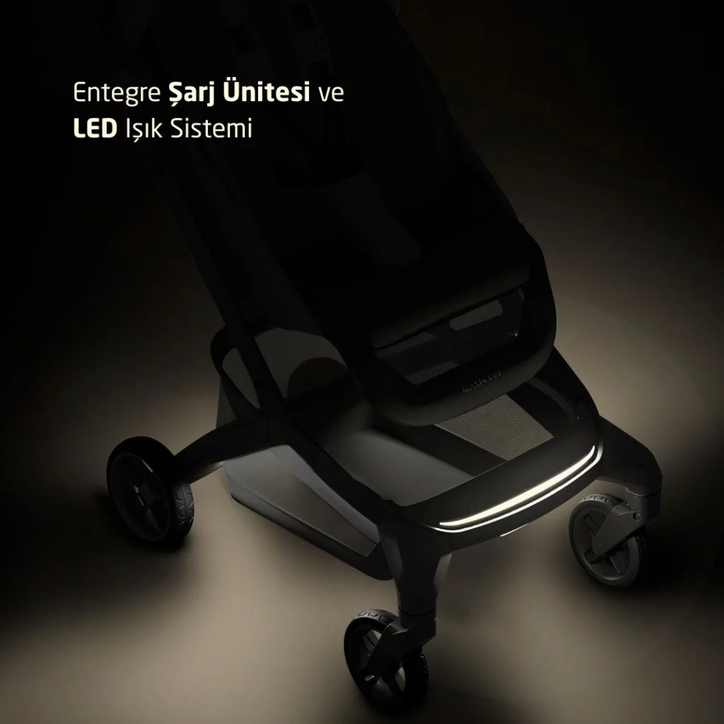 LED aydınlatma sistemi, bebek arabasının gece veya tren istasyonları veya otoparklar gibi daha karanlık yerlerde görünürlüğünü artırır. Bu, öğleden sonra geç saatlerde eve dönen veya akşamları gezintiye çıkan aileler için harika bir çözümdür.